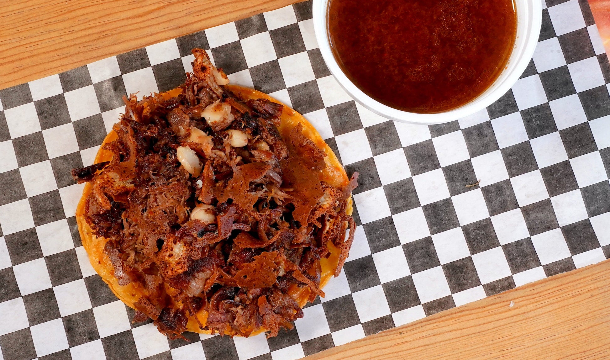 Deliciosa birria dorada montada en tortilla de maíz tostada.